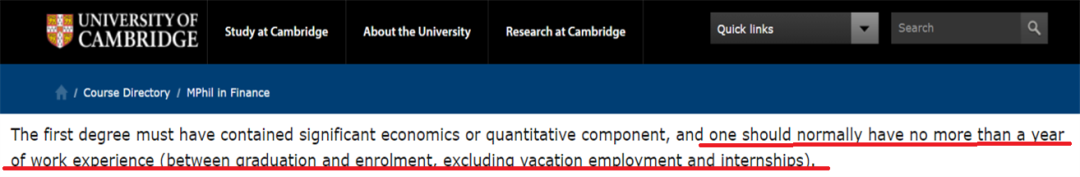 另外,需要提醒大家的是,劍橋大學的“Finance”專業(yè)在申請要求中明確指出,申請人通常需要具備一年以下的全職工作經驗。