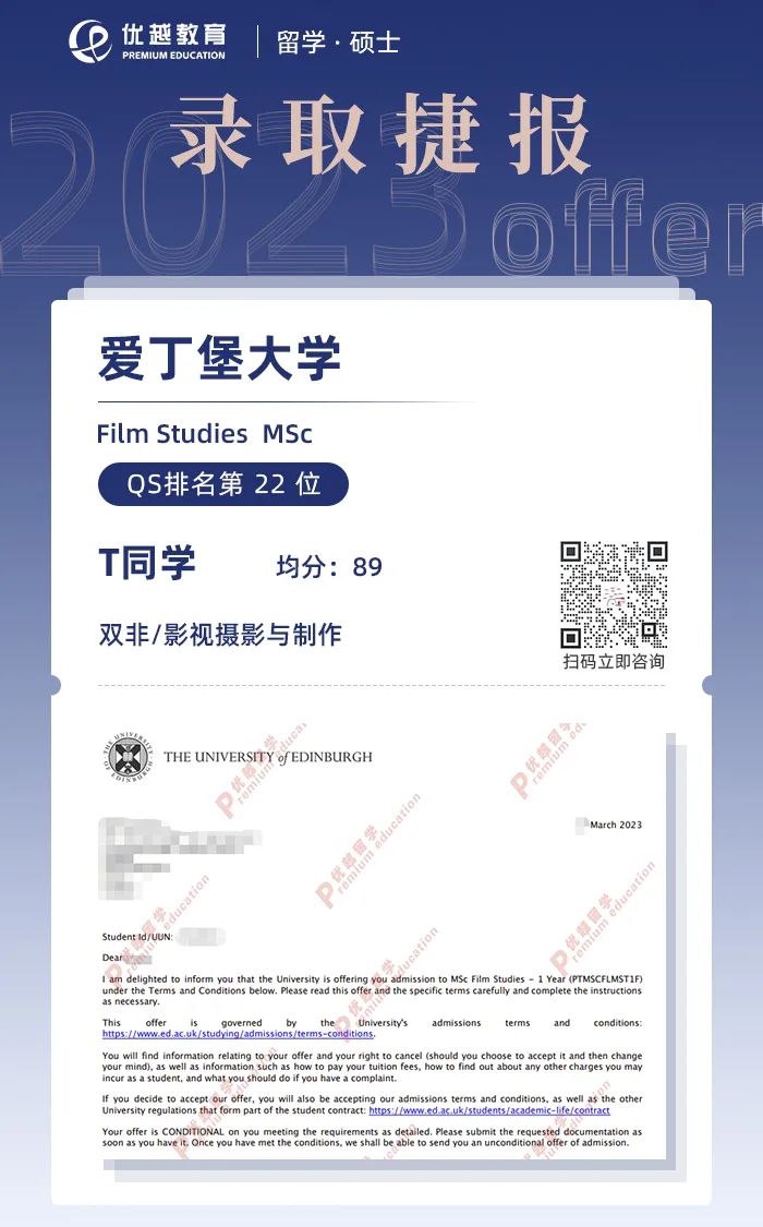 在T同學(xué)、家長以及優(yōu)越顧問老師和文創(chuàng)團(tuán)隊的共同努力下,帶著出色的文書為X同學(xué)遞交了申請,于3月順利拿到了愛丁堡大學(xué)的offer!