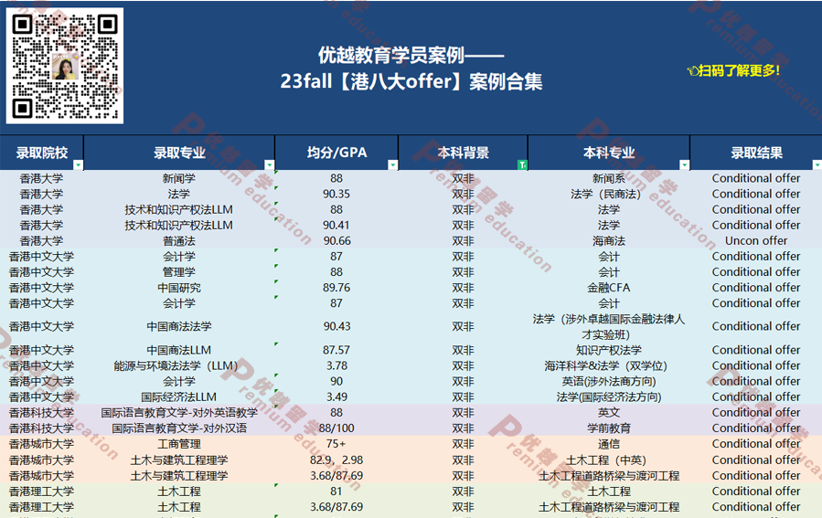 例如,以下是23fall雙非背景成功申請到港八大的部分案例。想查看完整的《港八大案例合集》,請掃碼下圖加微信獲取: