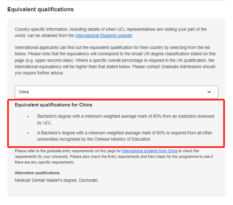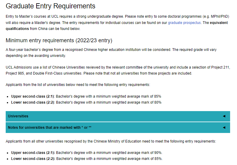UCL把陸本學校歸為兩類,第一類是官網這個Universities里面的,第二類就是不在清單內的其它陸本學校,確認對應的最低錄取分數即可。除了學校的門檻,各個專業還有自己的GPA門檻,例如UCL的LLM,就有85,87.5和90分三種con法。