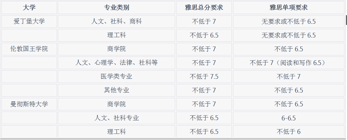 一般情況下,英國排名較低的院校對雅思的要求大約在6.5分以上,而頂尖院校(G5院校)通常需要7分以上,其中單項不低于6.5分。