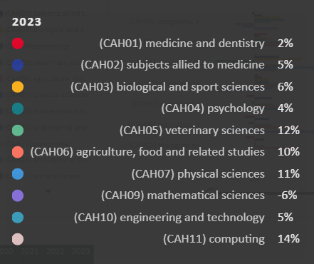 ??舉個例子,2023年農業和獸醫科學veterinary science的申請人數比2022年增加了12%,但實際上申請人數只有1840。