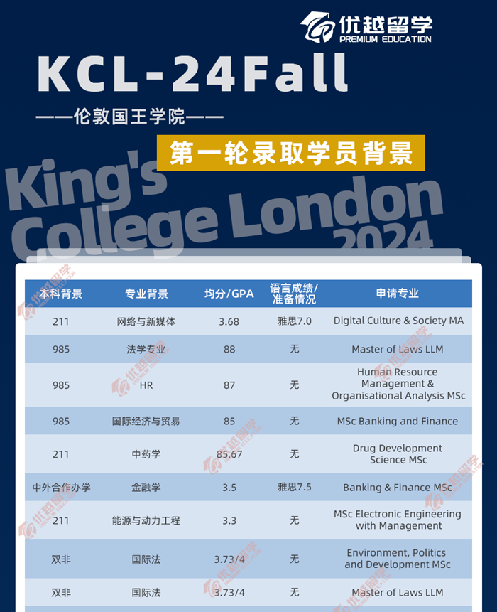 為了方便同學(xué)們更直觀地看到KCL的錄取硬背景實力要求,優(yōu)越君從24Fall10月第一批投遞的上岸同學(xué)名單中截取了一部分,同學(xué)們可以做個參考。
