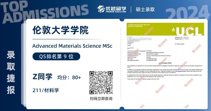 Z學(xué)姐是22年11月來(lái)到優(yōu)越的,經(jīng)過(guò)近一年的準(zhǔn)備,最終拿到了UCL高級(jí)材料科學(xué)碩士offer。今天,我們就一起看看,Z學(xué)姐在過(guò)去一年中,都做了哪些關(guān)鍵動(dòng)作,最終贏得UCL的青睞的~