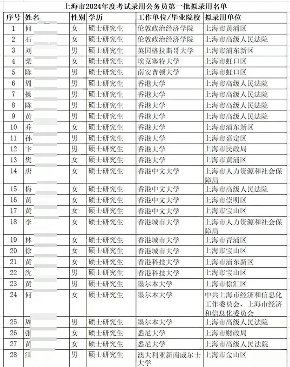 最近,上海市公務員2024錄用名單在分批公示了,不少網(wǎng)友眼紅,“今年上岸的,基本上都不是普通家庭的孩子。”會出現(xiàn)這種說法主要是由于,今年放榜的錄用名單,清一色碩士不說,至少30+崗位是海歸碩士直錄!