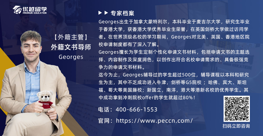 D學(xué)長的文書材料歷經(jīng)了材料收集-初稿撰寫-潤色修改-終稿定稿-院校拆分,前后用時3周的時間。期間,外籍文創(chuàng)主管Georges多次與D學(xué)長進行思維碰撞,不斷優(yōu)化框架和尋找最優(yōu)切入點。同時,PS經(jīng)過了多輪的細化修改、潤色打磨,最終呈現(xiàn)完美體現(xiàn)了D學(xué)長個人的競爭優(yōu)勢。