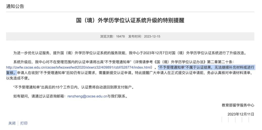 在去年12月的時候,教育部留學服務中心對系統進行了升級改造,新增了“不予受理通知單”,這條規定意味著,自2024年起,在申請留學學歷認證時,提交材料不符合要求將無法進行補救,只能重提提交認證申請!