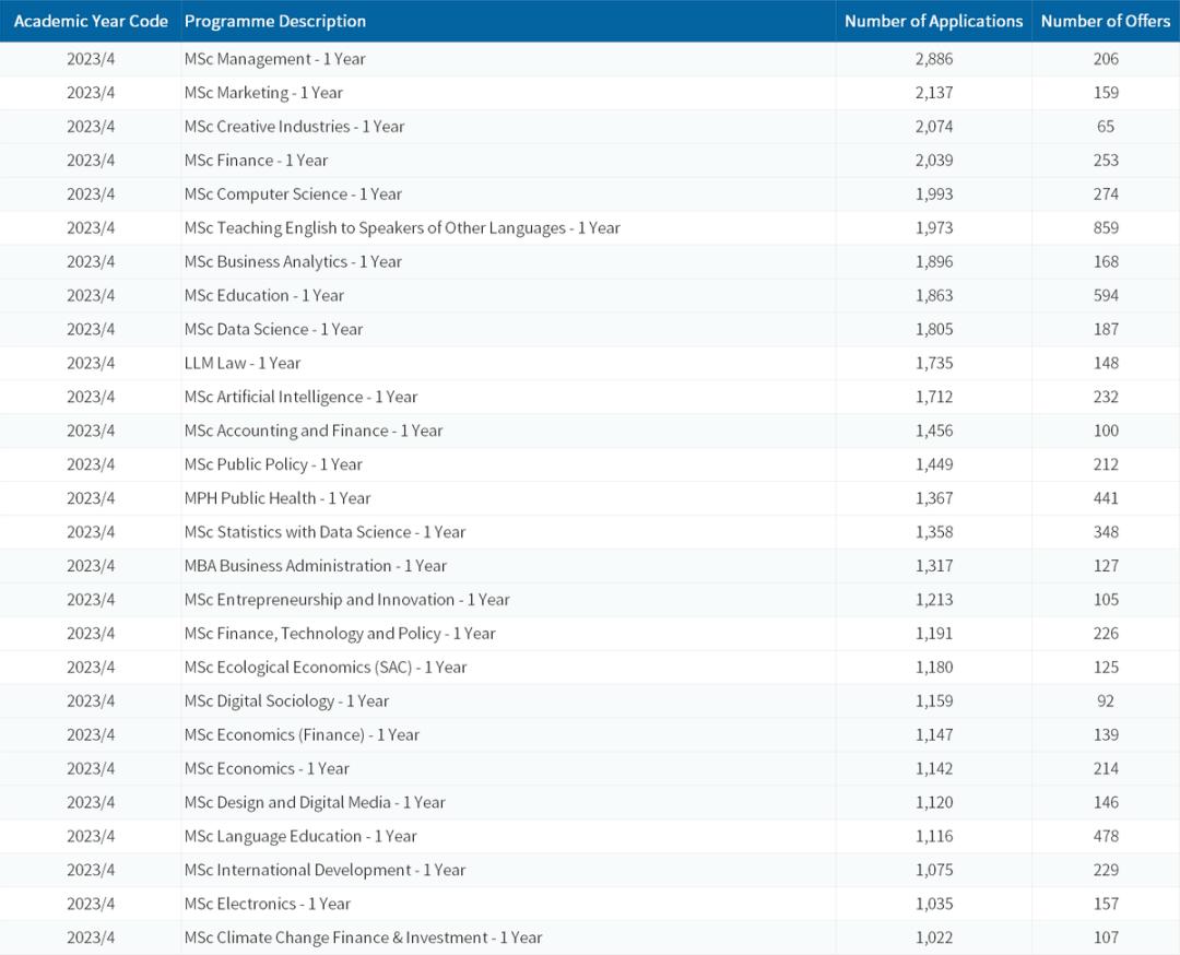 根據愛丁堡大學最新公布的23fall研究生錄取數據,申請人數最多的專業主要集中在幾個熱門領域。其中,管理學碩士以2,886份申請位居榜首,市場營銷碩士、創意產業碩士和金融學碩士的申請數也均超過2,000份。