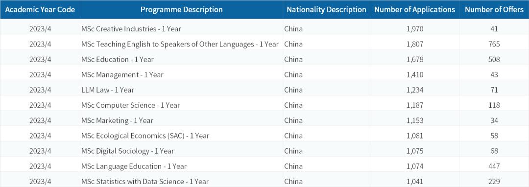 在23fall的申請季中,中國學生對愛丁堡大學的部分專業表現出極高的熱情。創意產業碩士成為中國學生申請量最多的專業,共有1,970名中國學生遞交了申請。然而,該專業的錄取率并不高,僅對中國學生發放了41個offer,錄取率僅為2.1%。