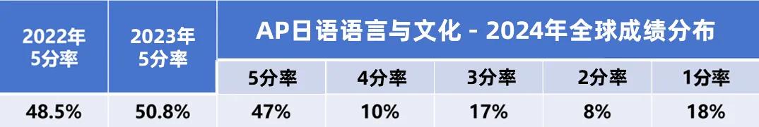 該項目選擇的學生數量很少,2024年全球共有2500名學生參與了日語考試,有3個學生獲得了滿分。根據官方最新數據,AP日語語言與文化近幾年5分率一直在持續下降,后來學生選課需慎重考慮一下。