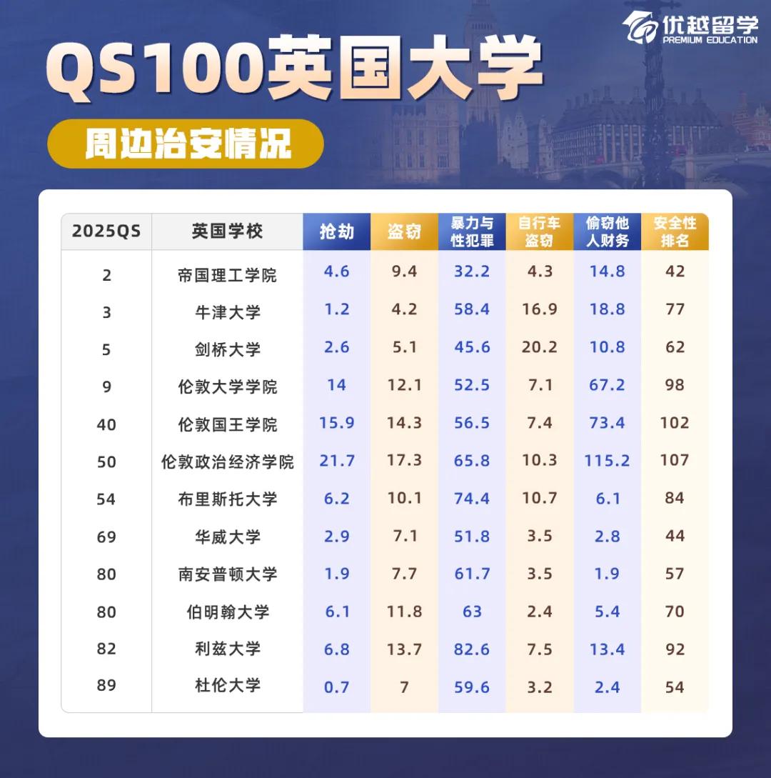 留學在外,人身安全至關重要!!今天,優越君將結合英國完全大學指南以及UKCrimeStats.com發布的最新數據,帶大家一起看看英國QS100大學周邊犯罪率排名情況,24Fall的同學早知道早預防,25Fall的同學可以在選校時提前考慮好安全問題。