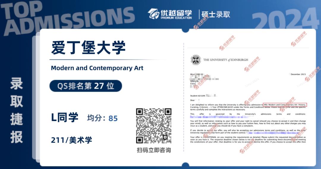 以上是【本期案例分享:【王愛曼華】均分80美術生,喜提愛大現代和當代藝術offer!】相關的全部內容,查看更多【名校案例】相關資訊可前往【優越留學】首頁!詳細申請規劃及方案定制請預約優越留學顧問為你一對一解答!