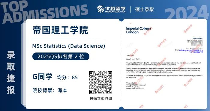 以上是【本期案例:【G5名校】海本數學學霸,4個月拿下世界top2帝國理工學院數據科學offer!】相關的全部內容,查看更多【offer榜單】、【名校案例】相關資訊可前往【優越留學】首頁!世界名校申請,找優越留學!選校定校、申請規劃、文書寫作、背景提升、方案定制一套搞定!點擊【在線咨詢】,優越留學顧問24h在線為您一對一解答!