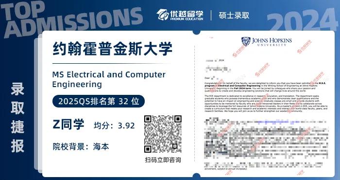 以上是【【美國名校】電子工程學姐超高GPA,拿下約翰霍普金斯大學JHU碩士offer!】相關的全部內容,查看更多【名校案例】相關資訊可前往【優越留學】首頁!詳細申請規劃及方案定制請預約優越留學顧問為你一對一解答!