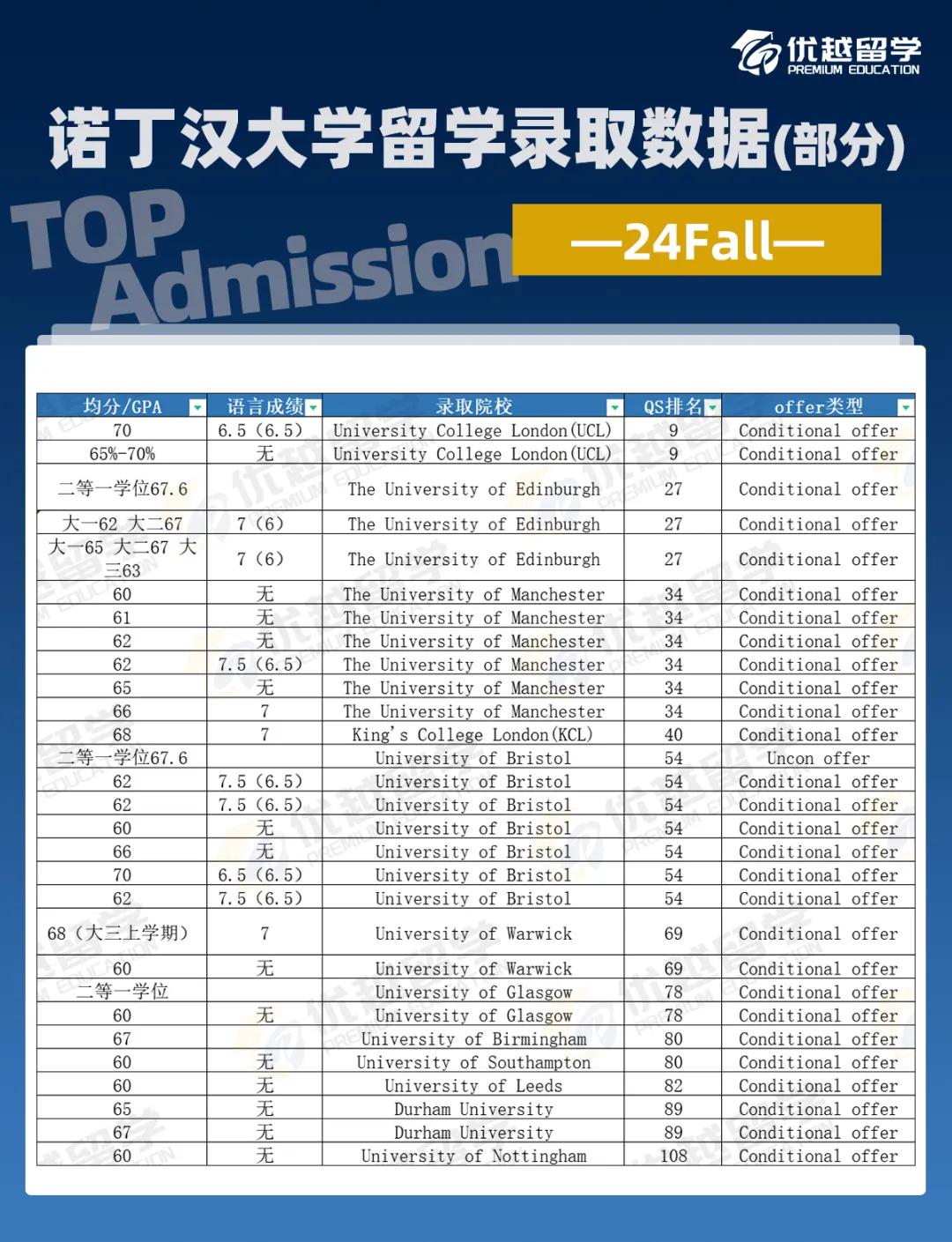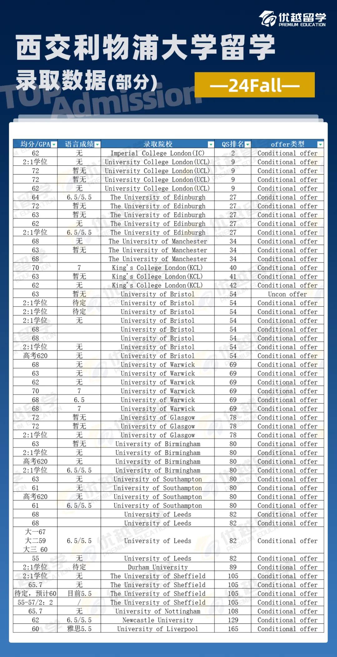 此外,優越數據庫中,24Fall 中外合辦背景學員收獲的英國方向錄取中,offer率高達99.6%,其中 96% 的 offer 來自 QS 全球前百院校。