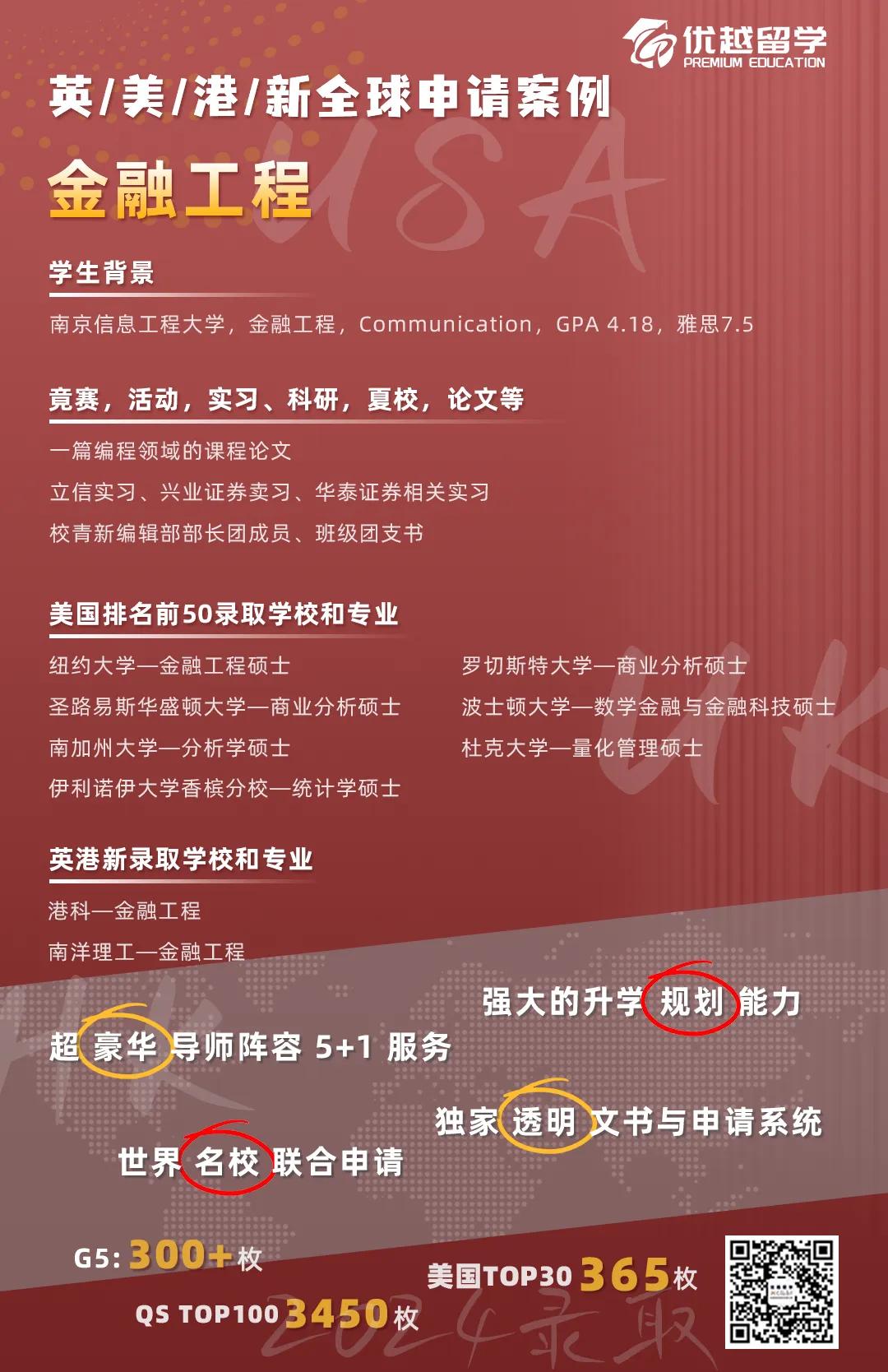 M學姐來自南京信息工程大學金融工程專業,在24Fall碩士留學申請申請季里,選擇了優越留學的全球聯申,拿下了美國紐約大學、南加州大學、香港港科、新加坡南洋理工大學9所名校offer!