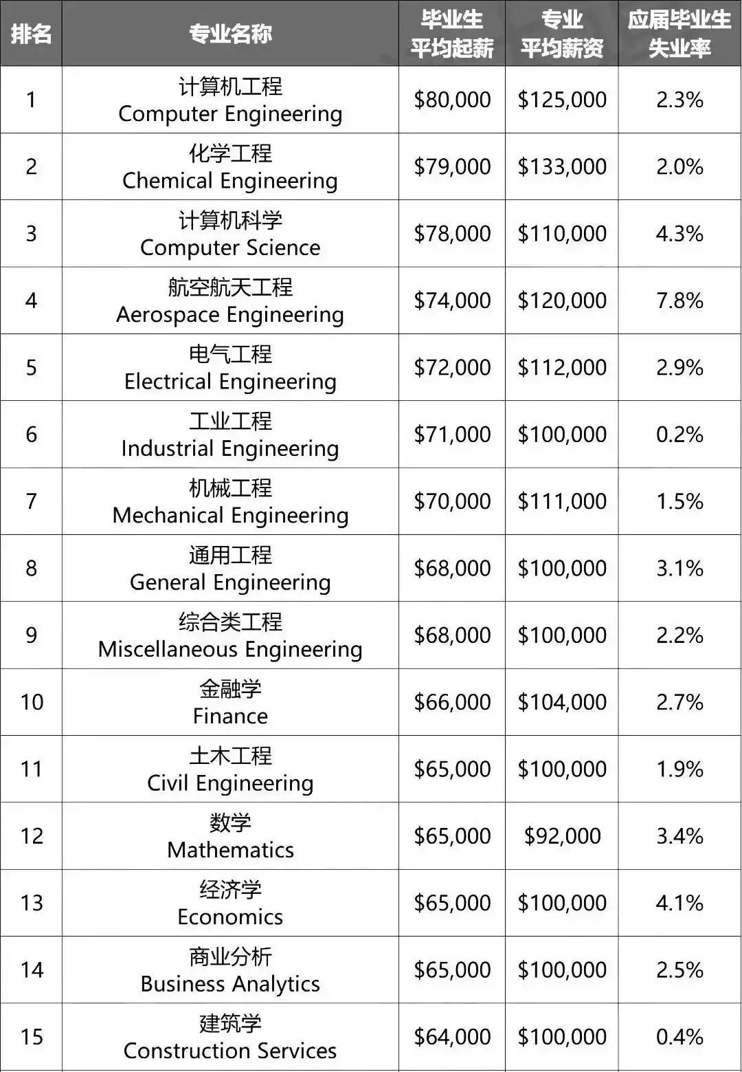 不同于英國的金融贏家,在美國,不管是起薪還是后期平均薪資方面,工程類專業才更勝一籌。