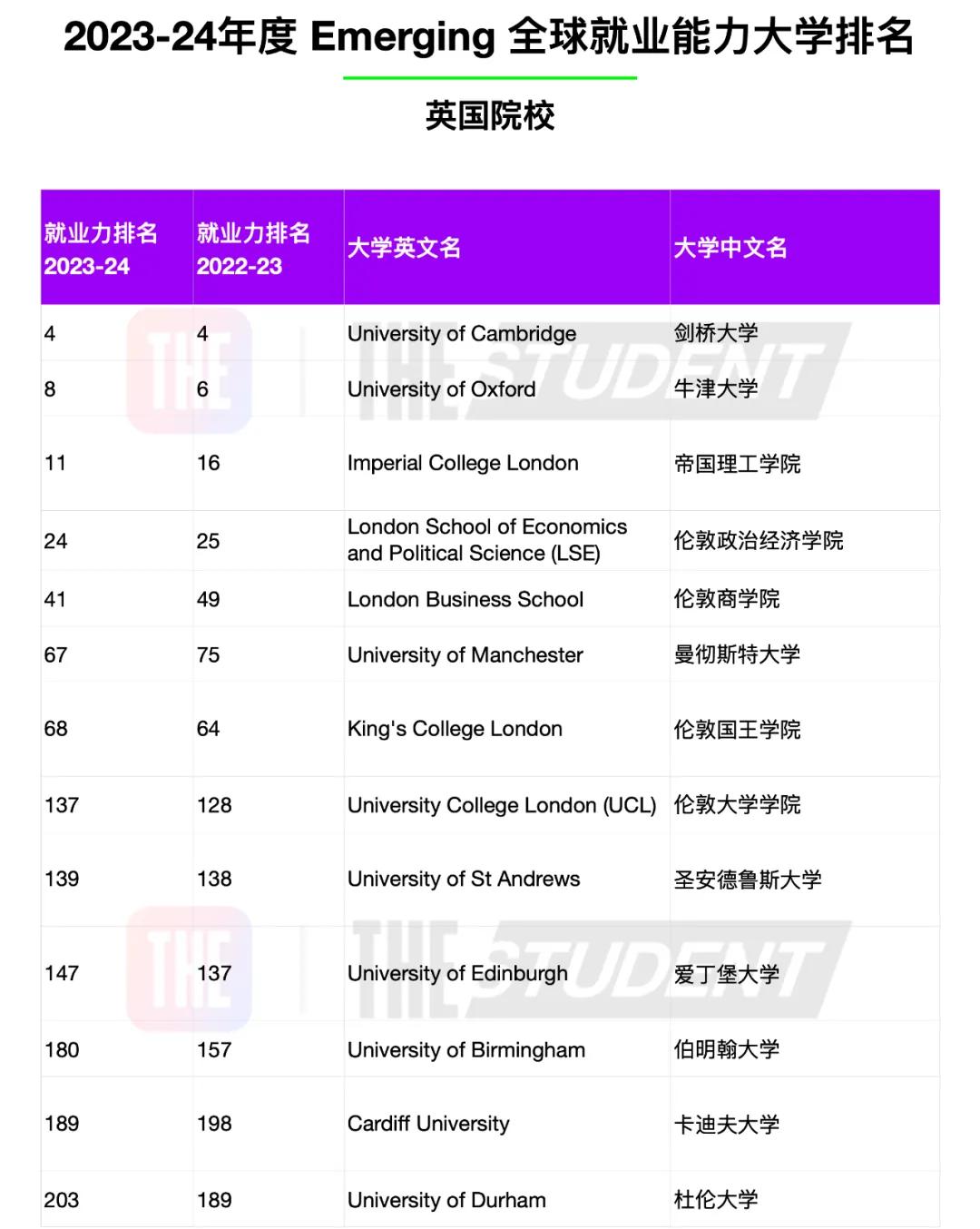 根據THE全球就業力排名調查,我們發現:英國方面,劍橋大學和牛津大學占據了英國排名的前兩位,是畢業生就業能力排名前十名中僅有的兩所英國院校,分別排名第4位和第8位。