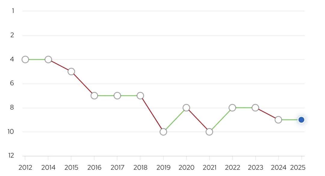 帝國理工學院便是穩中有升的典型代表。從走勢圖我們可以看到,這10年,IC帝國理工學院一直默默發力,幾乎每年排名都在提升,到了今年,更是一躍飛升至第2,重回巔峰!