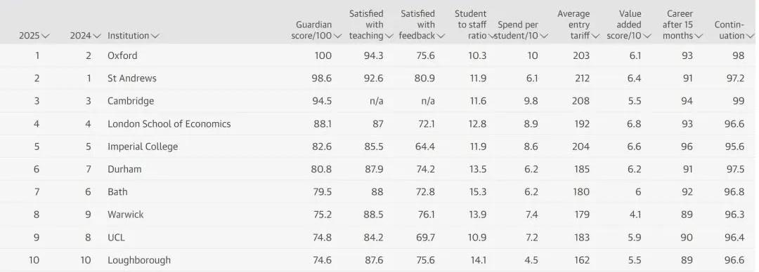 9月7日,被稱為“更適合本科生升學擇校的排名”——《衛報》發布了2025年英國最佳大學排名.