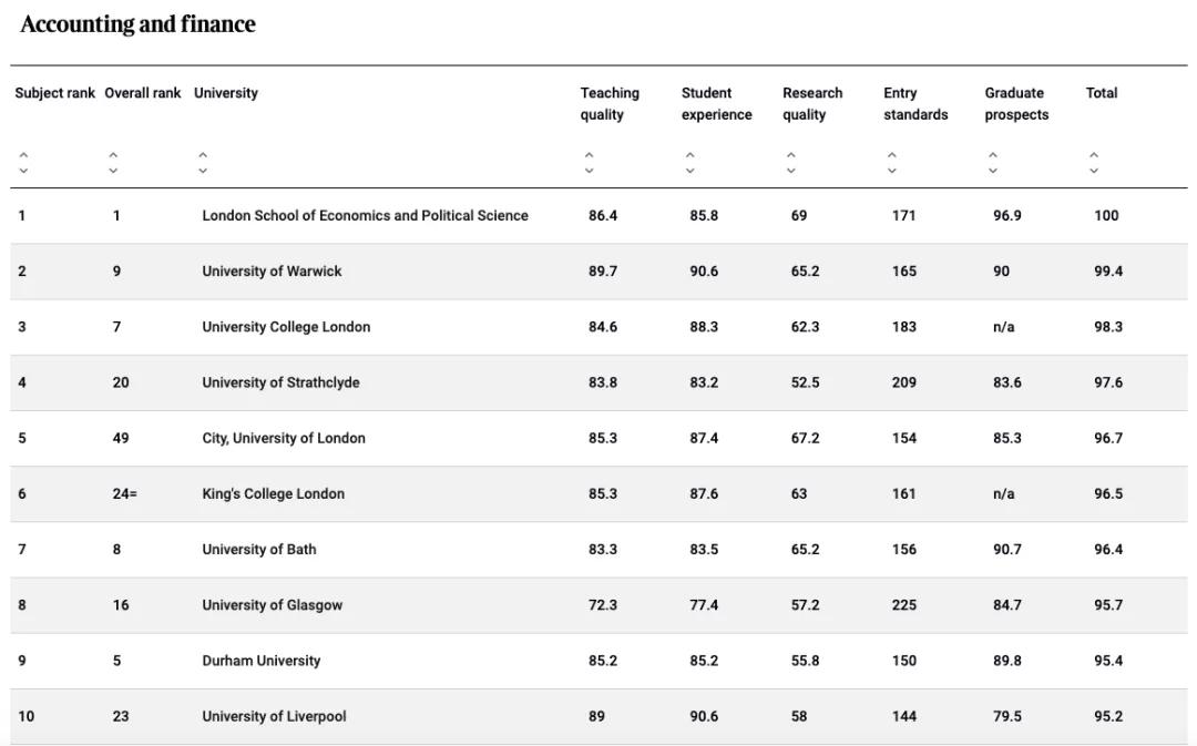 在會計金融專業的排名中,倫敦政治經濟學院(LSE)奪得頭籌,排名第一!華威大學和倫敦大學學院則緊隨其后,分列第二和第三。