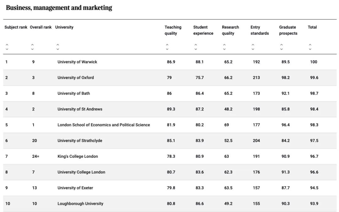 在商業、管理和市場營銷專業的最新排名中,華威大學名列榜首。緊隨其后的是一眾知名院校,包括牛津大學、巴斯、圣安德魯斯大學以及倫敦政治經濟學院(LSE)等備受矚目的學府。