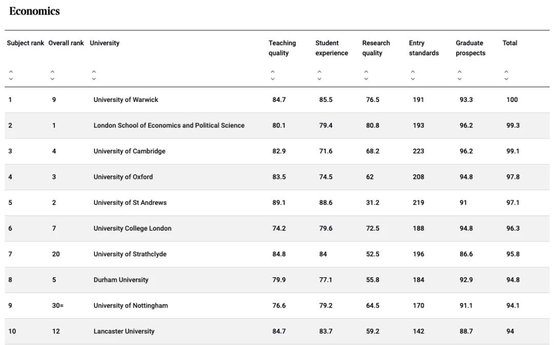 在最新的經濟專業排名中,華威大學傲視群雄,穩坐榜首。其次,倫敦政治經濟學院LSE和劍橋大學分列第二和第三,繼續展現出卓越的學術實力。