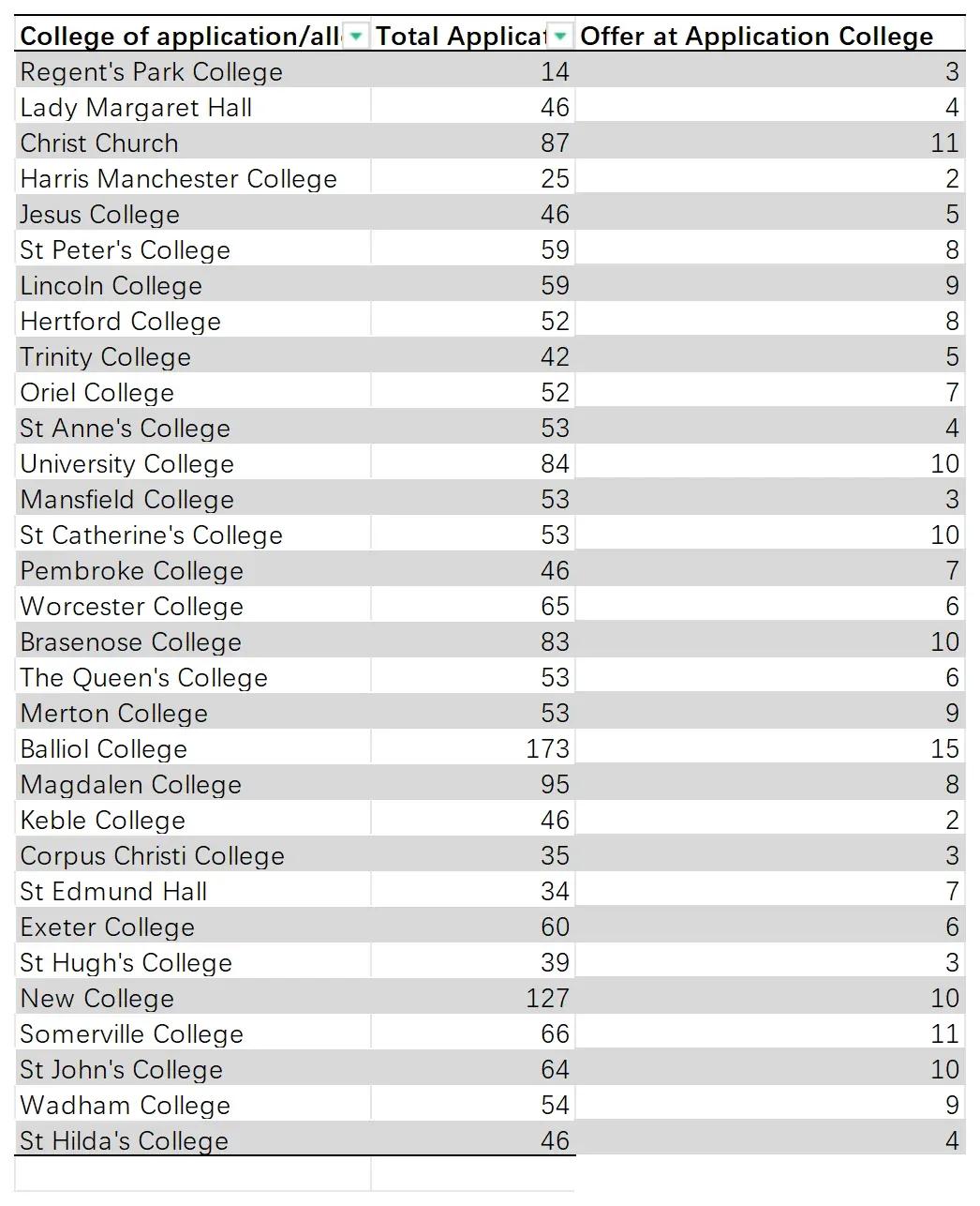 *牛津各學院PPE專業申請者的申錄數據