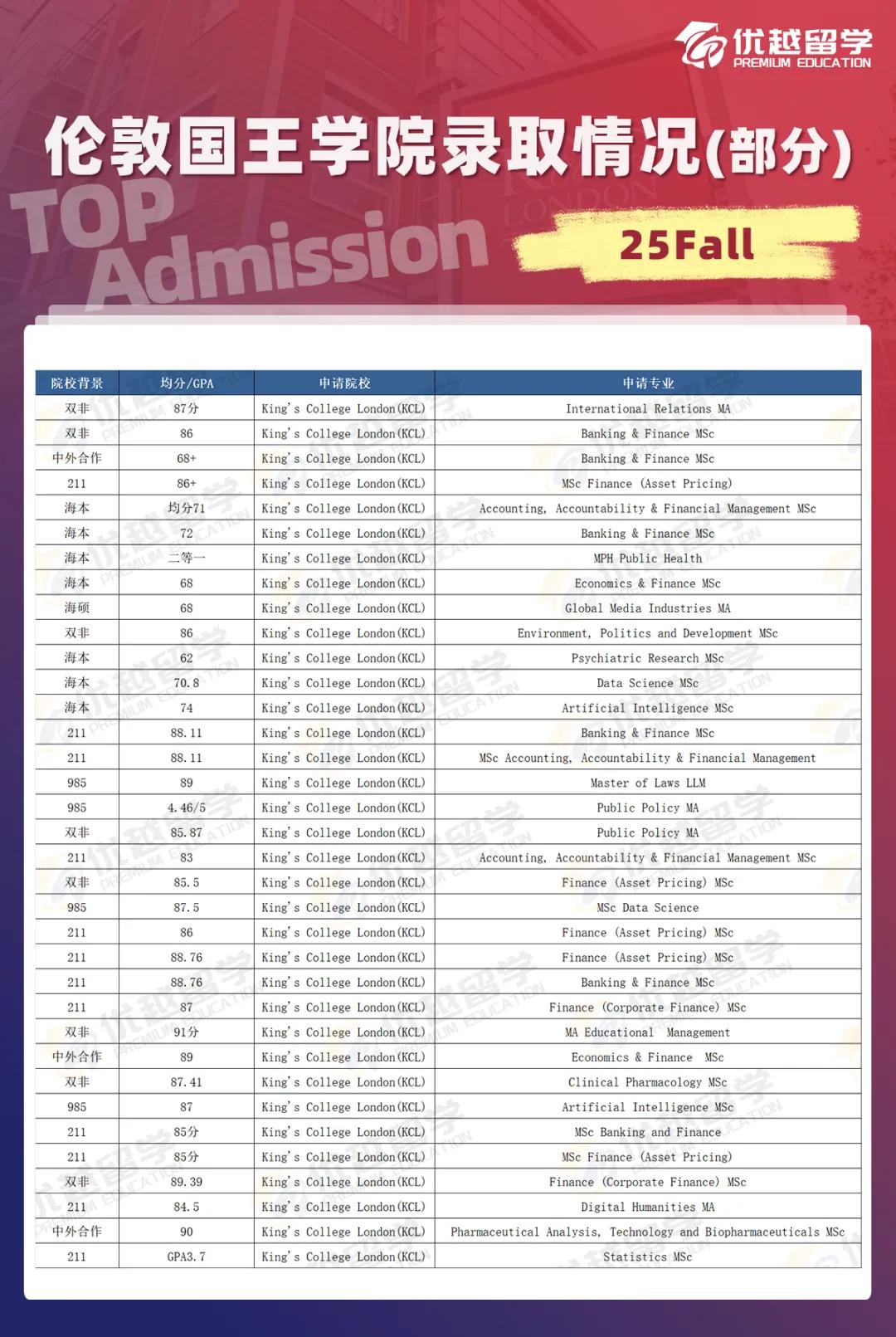 以上是【【英國留學】拒信滿天飛?KCL倫敦國王學院25Fall碩士錄取情況盤點!】相關的全部內容,查看更多【 英國碩士留學申請】相關資訊可前往【優越留學】首頁!詳細申請規劃及方案定制請預約優越留學顧問為你一對一解答!