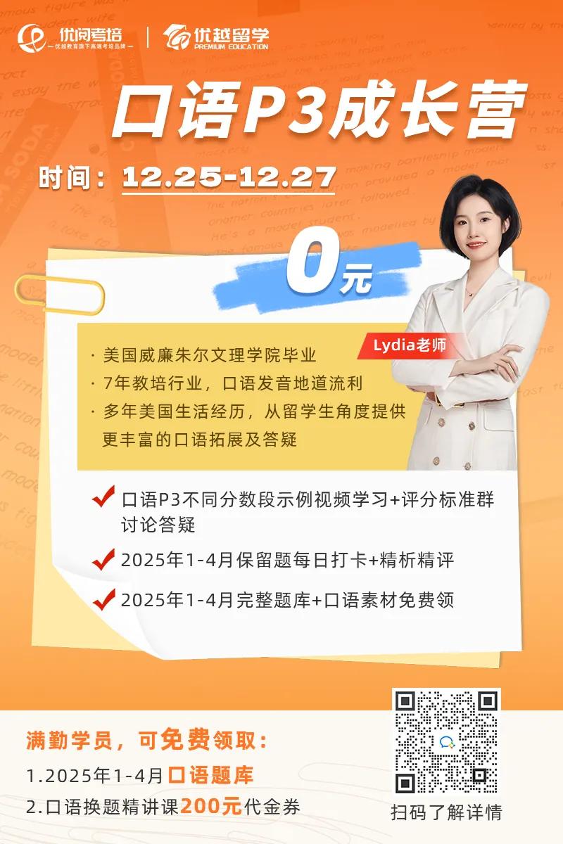 如果口語P3和P1/P2的表現差異比較大,很容易讓考官懷疑前面的答案都是背的!要知道,雅思口語的紅線就是背答案,套模板,一旦被發現,分數會直接崩盤。想要快速提高口語能力的同學,可以參加我們的口語成長營哦~