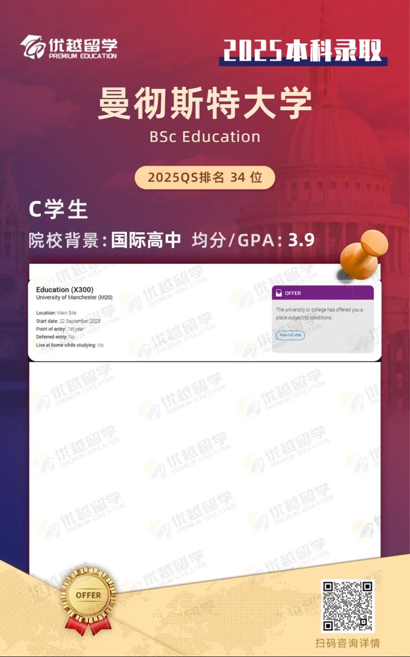 功夫不負有心人,憑借優異的學術成績、豐富的實踐經歷以及真摯且富有內涵的申請材料,他最終成功收到了曼徹斯特大學的本科offer。我們也祝C同學25Fall一切順利!