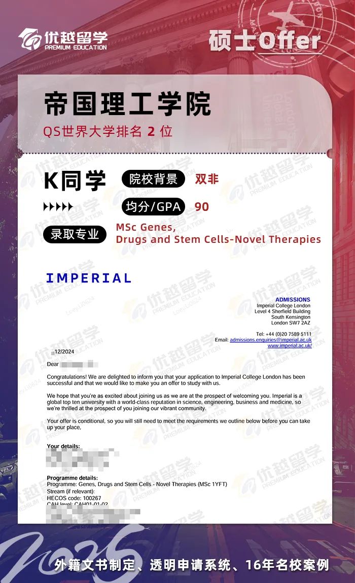 ? 錄取院校及專業(yè):帝國理工學(xué)院-基因,藥物與干細胞新療法