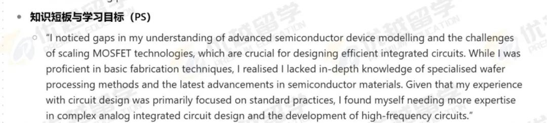 對于自己的均分,我們也在文書中坦誠地指出自身在半導體領域的知識欠缺,為申請該專業的必要性提供了有力依據,也顯示出其對自身發展的清晰認知。