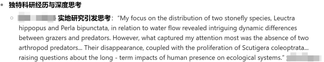 我們在文書中詳細描述了L同學的通過實地研究引發的深度思考,從現象深入思考人類活動對生態系統的影響,這種深度思考體現出遠超本科成績的科研素養和對專業問題的洞察力,讓招生官看到其科研潛力。體現出主動探索和深入研究的精神,這在申請者中較為突出,彌補了本科成績的不足。