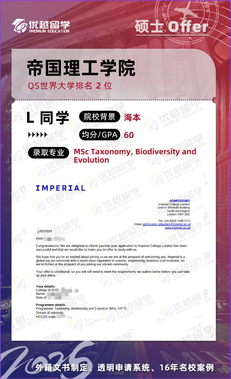 ? 錄取院校及專業:帝國理工學院-MSc Taxonomy, Biodiversity and Evolution