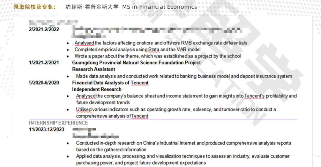 但深入了解后,我也發(fā)現(xiàn)了他申請(qǐng)路上的一些阻礙。雖說他有著耀眼的學(xué)術(shù)成績(jī)和一定的實(shí)踐經(jīng)歷,但軟性背景方面存在不足。他實(shí)習(xí)的校外金融公司知名度較低,工作內(nèi)容也比較基礎(chǔ),大多是數(shù)據(jù)整理這類工作。校內(nèi)研究助理的工作也多是輔助性任務(wù),沒有獨(dú)立的成果產(chǎn)出。而且,他缺乏高含金量的科研論文、競(jìng)賽獎(jiǎng)項(xiàng),也沒有在知名企業(yè)實(shí)習(xí)的經(jīng)歷。在競(jìng)爭(zhēng)激烈的金融工程碩士申請(qǐng)中,這些短板很容易讓他被其他背景出色的學(xué)生比下去。