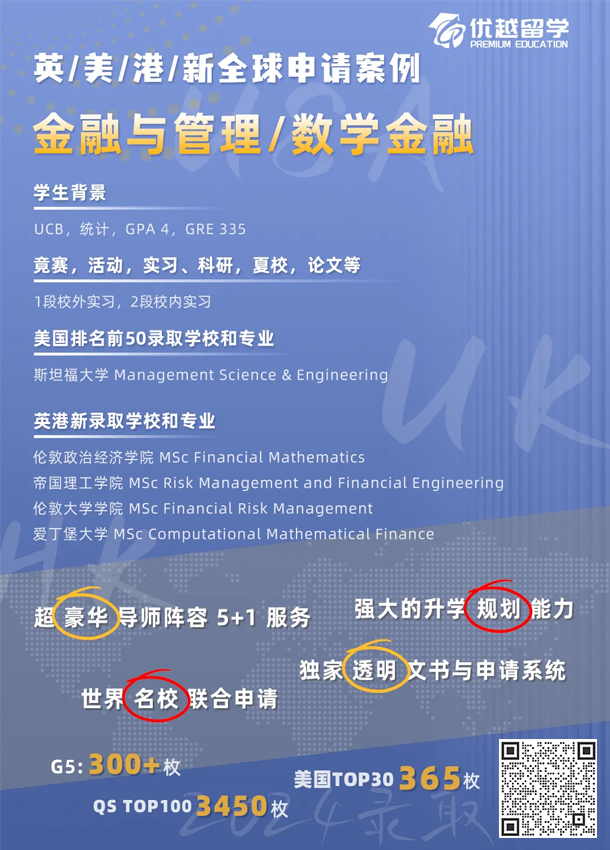 以上是【本期案例:【碩士案例】985滿績(jī)點(diǎn),英美聯(lián)申拿下斯坦福大學(xué)、IC帝國(guó)理工學(xué)院offer! 】相關(guān)的全部?jī)?nèi)容,查看更多【offer榜單】、【名校案例】相關(guān)資訊可前往【優(yōu)越留學(xué)】首頁(yè)!世界名校申請(qǐng),找優(yōu)越留學(xué)!選校定校、申請(qǐng)規(guī)劃、文書寫作、背景提升、方案定制一套搞定!點(diǎn)擊【在線咨詢】,優(yōu)越留學(xué)顧問24h在線為您一對(duì)一解答!