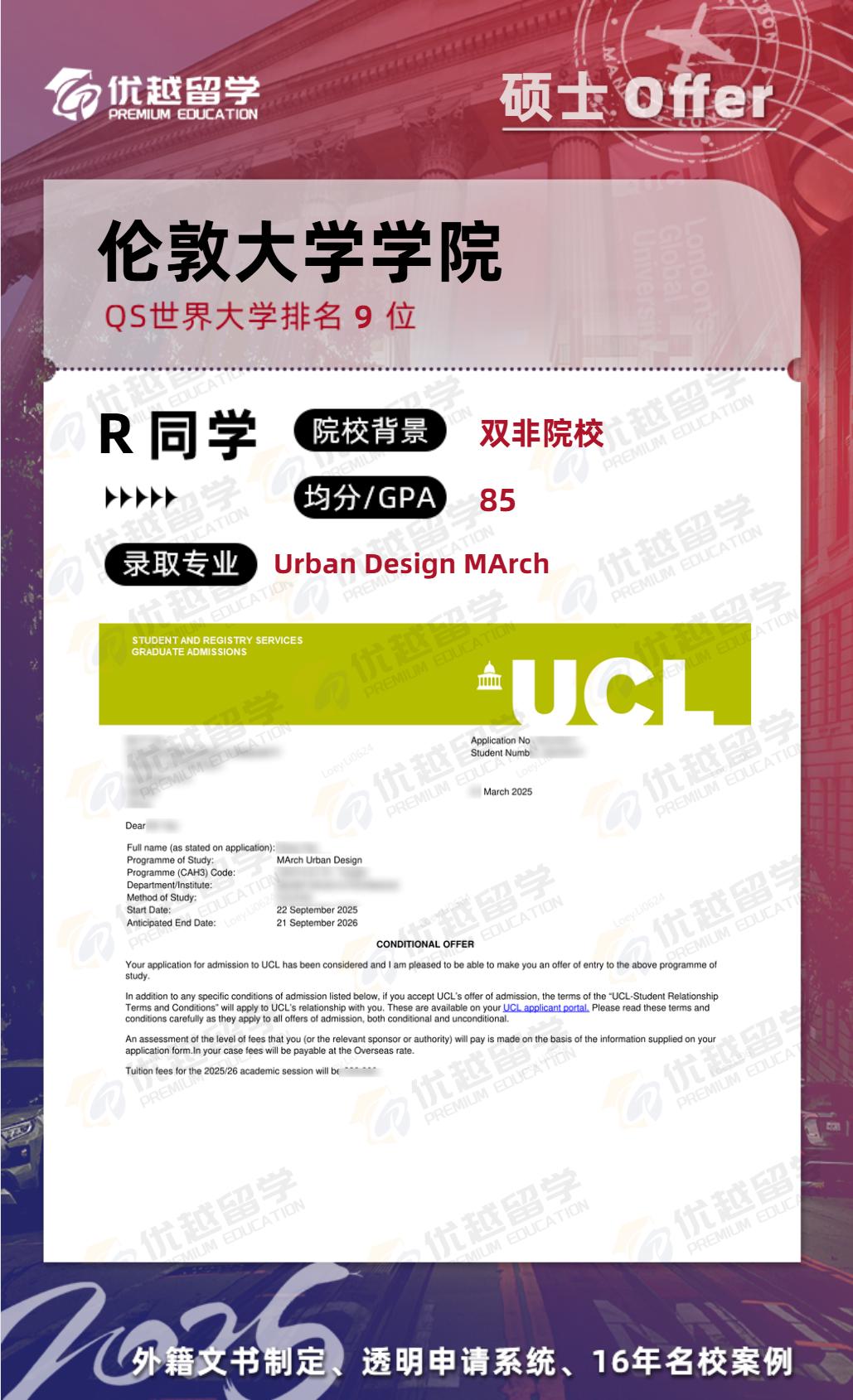 R同學來咨詢的時候,其實心里早就有明確的目標:QS前50的英國院校。這個來自雙非院校建筑專業的學生,均分85分。坦白講,這個硬件條件放在UCL和愛丁堡大學的申請池里,確實是再普通不過的背景。