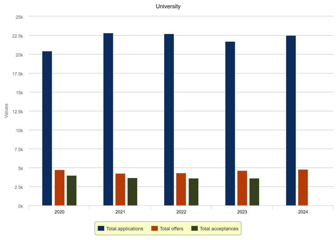 2024 申請(qǐng)季,有2308位中國學(xué)生向劍橋大學(xué)遞交申請(qǐng),最終獲得343封offer,錄取率約為14.86% 。