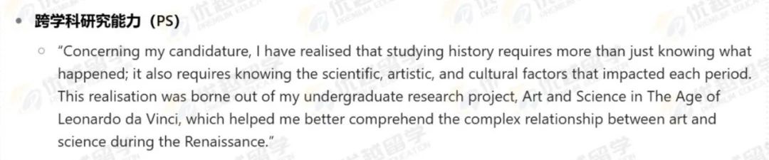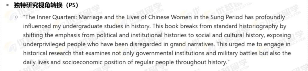 在Z同學(xué)的PS 中最突出的是其獨(dú)特的研究視角轉(zhuǎn)換與跨學(xué)科研究能力,以及基于此構(gòu)建的清晰且長(zhǎng)遠(yuǎn)的學(xué)術(shù)規(guī)劃,充分展現(xiàn)出學(xué)術(shù)潛力與對(duì)歷史學(xué)專(zhuān)業(yè)的深度熱愛(ài)。
