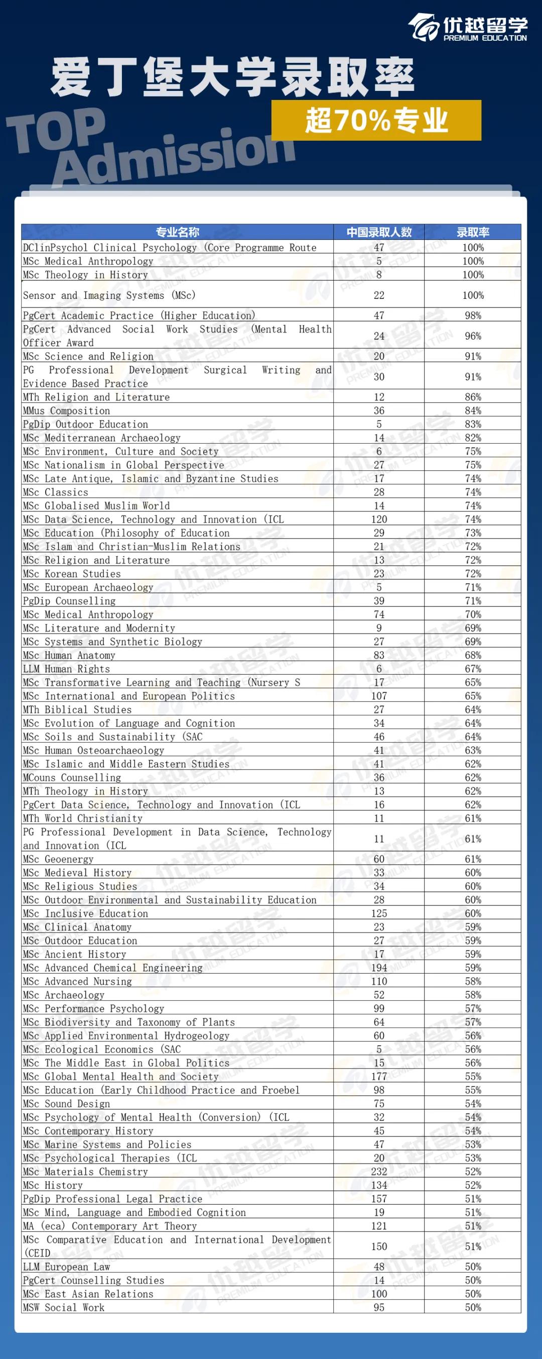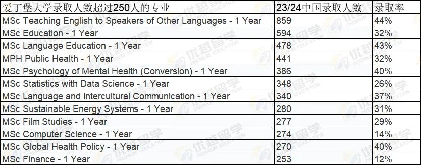 今天,優越君就來為大家詳細盤點愛丁堡大學研究生申請中,哪些專業更傾向于錄取中國學生。考慮到專業眾多,下面會在不同學科領域挑選一個專業作為代表進行深入介紹,完整專業信息可查看下方圖表。話不多說,馬上開啟揭秘之旅!