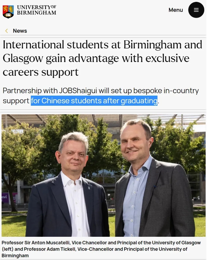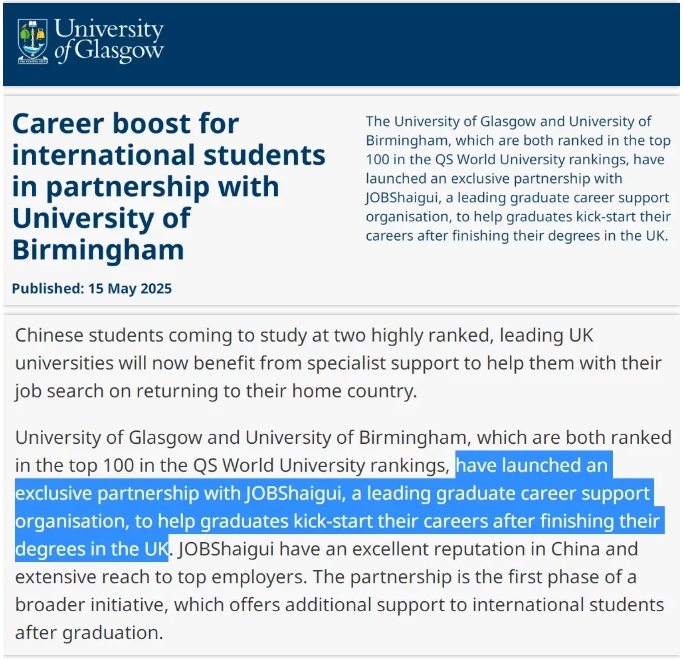 最近英國英國QS100名校留學圈傳來大新聞!伯明翰大學(QS 第 84)和格拉斯哥大學(QS 第 76)官宣聯(lián)手中國求職平臺 JOBS 海歸,專門給中國留學生設了個「回國就業(yè)支持項目」!這波操作直接戳中了留學生的痛點—— 畢竟讀完書回國找工作,誰不想有個「加速器」呢?今天就來聊一聊這個利好,順便扒扒英國大學在就業(yè)支持上的那些事兒。