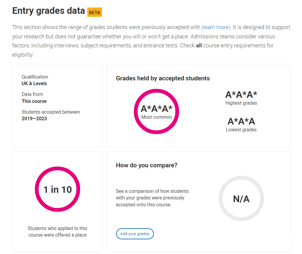而UCAS上線的這個(gè)search tool,只需要輸入目標(biāo)專業(yè)名稱,就可以給你呈現(xiàn)2022-2024 年被錄取學(xué)生的 A-level 成績,包括最高分、最低分以及錄取比例!也就是說,我們可以借助這個(gè)工具,直接看清英國大學(xué)官網(wǎng)申請要求與真實(shí)門檻之間的“鴻溝”。