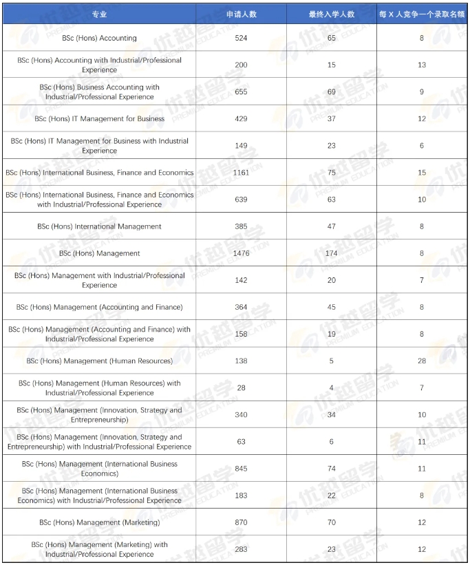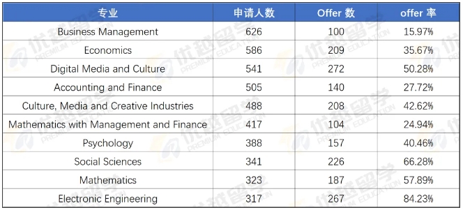 不過熱門專業差異明顯:商業管理專業申請 626 人,僅 100 人錄取(15.97%);但也有offer率是很友好的,以電子工程專業為例,有317人申請,其中267人收到offer,offer率高達84.23%。