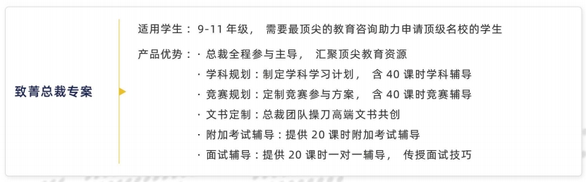 以上是【致菁系列】相關的全部內容,查看更多【優越留學產品服務體系】相關資訊可前往【優越留學】首頁!詳細申請規劃及方案定制請預約優越留學顧問為你一對一解答!