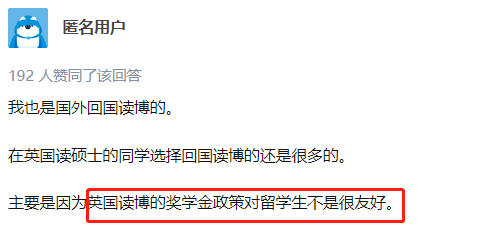 正如一位匿名用戶所言(192 人贊同該回答):"我也是從國外回國讀博的。在英國讀碩士的同學選擇回國讀博的不在少數,主要原因在于英國讀博的獎學金政策對留學生不太友好。"