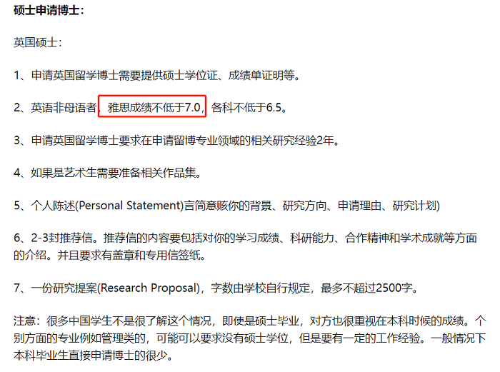 其次,英語成績也是英國申博的一大門檻。雖然國內普通 985 高校讀博的雅思成績要求通常只需超過 5.5 分,但英國讀博對英語的要求要高得多,一般要求非英語母語者達到 7.0 分的雅思成績,這一高標準無疑增加了申請的難度。