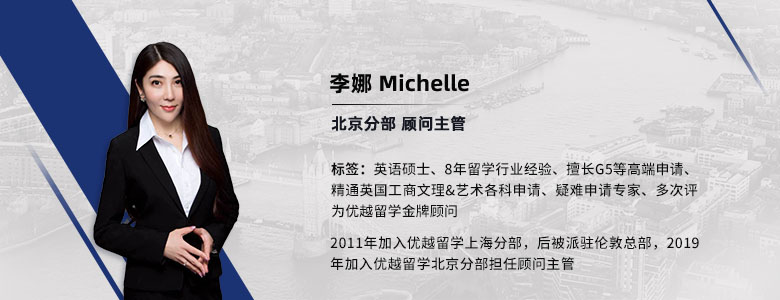 優越留學北京分部Michelle老師加入優越留學已有8年時間,現任優越北京一組顧問主管,超過7年一線留學顧問工作積累了十分豐富的案例經驗,以專業度著稱,案例經驗十分豐富,精通英國碩士商科,文科,理工科,藝術設計,幾乎涵蓋碩士階段各個專業方向,尤其擅長處理高端申請和疑難雜癥,對工作敬業,對學生負責,多次被評為優越留學金牌顧問。