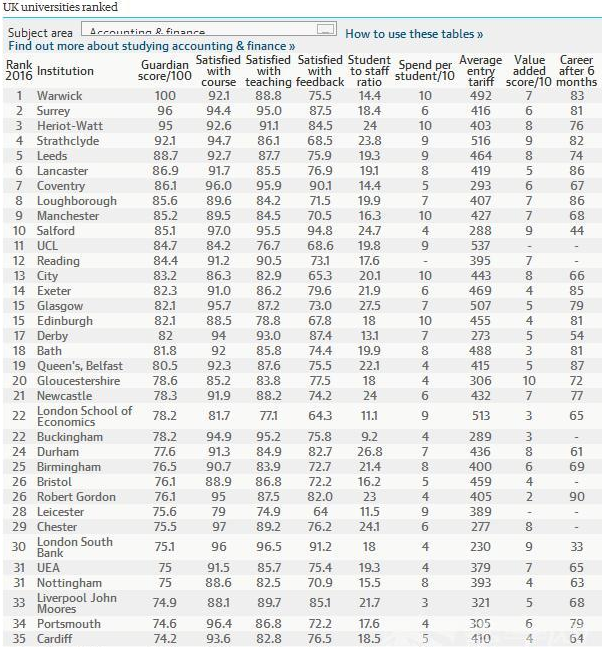 2016《衛報》英國大學會計與金融專業排名--優越教育