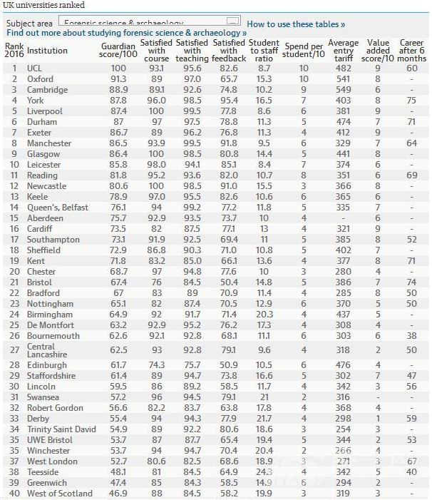 2016《衛(wèi)報(bào)》英國(guó)大學(xué)法醫(yī)科學(xué)和考古學(xué)專(zhuān)業(yè)排名--優(yōu)越教育